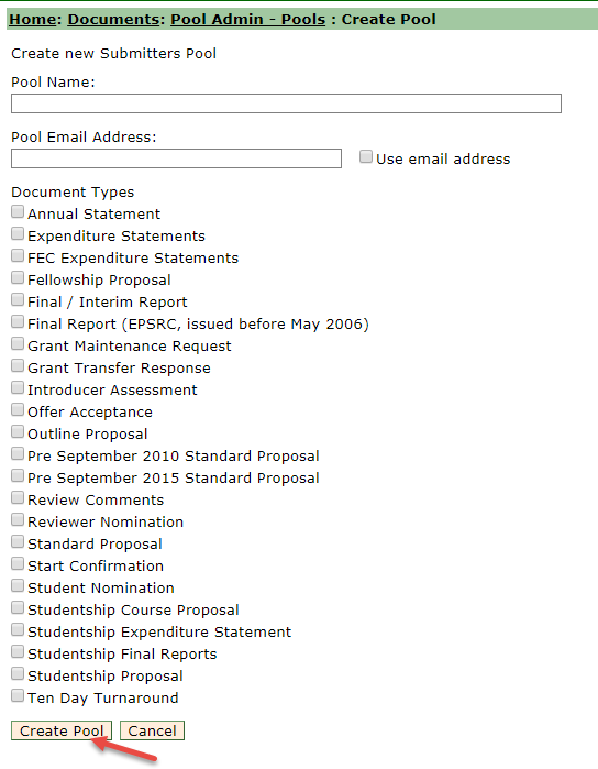 You can name the pool and select an email address (this is optional) to be used to notify when documents are submitted to this pool (this is not expected to be the email address of an individual, it should be a generic address). You can use the tick boxes to indicate which document types you would like to go into this pool and select Create Pool: