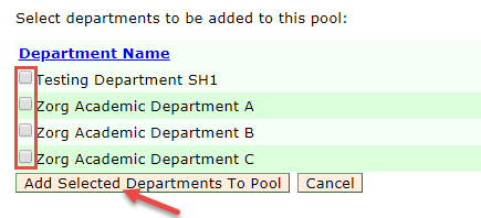 Select Show/Hide Pool Departments and then Add Department, you will be presented with a list of all the departments at your organisation, tick next to the one(s) you wish to select and then click ‘Add Selected Departments To Pool’ to allocate them to the new pool. A department can be in more than one pool as long as the specified document type is different: