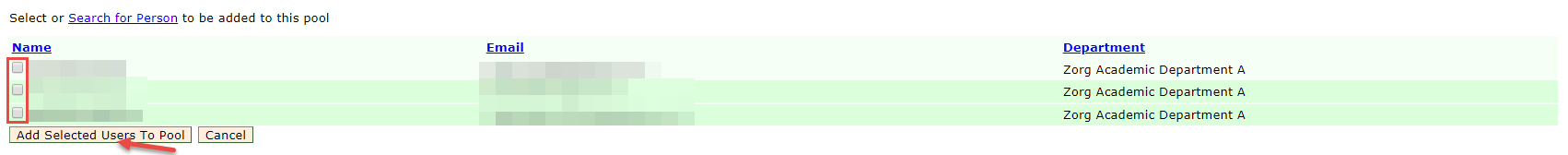 Select Show/Hide Pool Members and then Add Member, you will be presented with a list of all the individuals at your organisation, tick next to the one(s) you wish to select and then select and click ‘Add Selected Users To Pool to allocate them to the new pool: