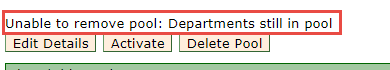 Delete pool will only be possible if all departments have been removed from the pool first, if they have not been removed you will receive an error message: